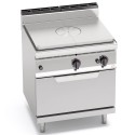 Plan de travail et façades en acier inoxydable AISI 304. Grande plaque en fonte épaisse à haute résistance et répartition de la chaleur par zones thermiques différenciées : température maximale au centre et décroissante vers les bords. Brûleurs centraux de 13 kW à combustion optimisée, activés par un robinet à soupape avec thermocouple de sécurité et veilleuse. Allumage piézoélectrique avec protection en silicone et revêtement de la chambre de combustion en vermiculite, un matériau isolant haute performance. Four à gaz statique équipé d'une veilleuse, entièrement en acier inoxydable, avec supports à 4 niveaux pour grilles et plateaux GN 2/1. Brûleur à flamme auto-stabilisante et thermostat réglable de 160 °C à 280 °C. Porte emboutie sans joint pour une meilleure isolation et une propreté optimale. Porte et contre-porte embouties en acier inoxydable AISI 304. Poignée de porte haute résistance en acier AISI 304 épaisseur 20/10. Pieds réglables. De série : allumage piézoélectrique du four, 1 grille anti-basculement.