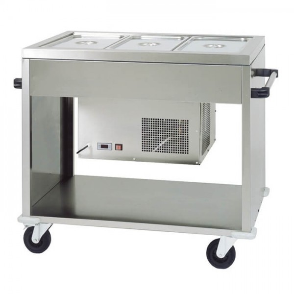 Carrello refrigerato in acciaio inox adatto a contenere 3 teglie GN 1/1. Ideale per catering e buffet.