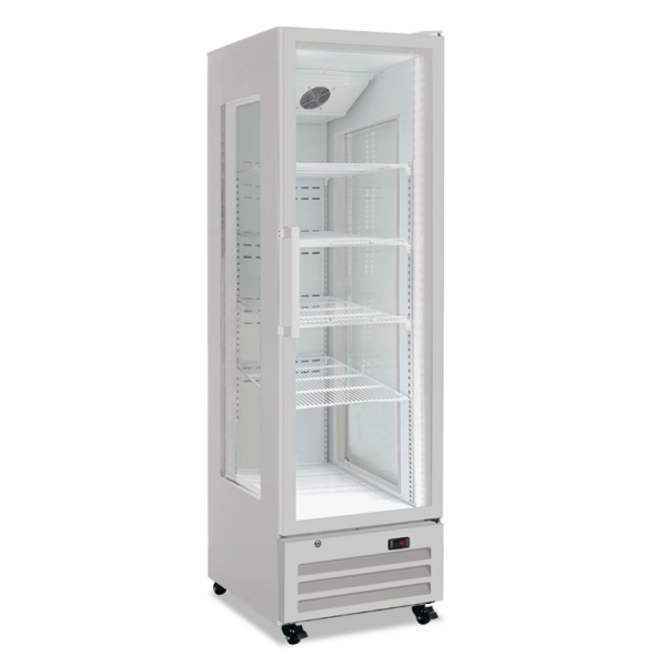 Frigo vetrina panoramica con tre lati in vetro da 360 litri con display digitale della temperatura esterno e sbrinamento automatico. È la soluzione ideale per bar, ristoranti e altre attività che desiderano esporre e conservare bevande e snack.