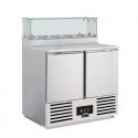 Saladette refrigerata a 2 porte con piano di lavoro in granito e vetrina ingredienti, perfetta per conservare alimenti freschi e di preparare piatti velocemente. Ideale per catering e fast food.